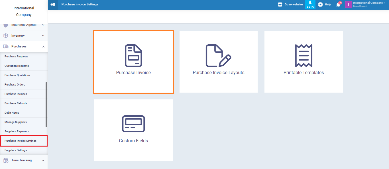 From the main menu, click “Purchases”, then select “Purchase Invoice Settings”, and choose “Purchase Invoice.”