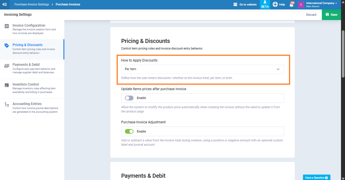 You can control the discount for each item in the purchase invoice instead of applying a total discount to all items together. To enable this feature, go to “Purchase Settings” under “Purchases” in the main menu, then click on “Purchase Invoice.” From the discount options field, select “Per Item” and click the “Save” button.