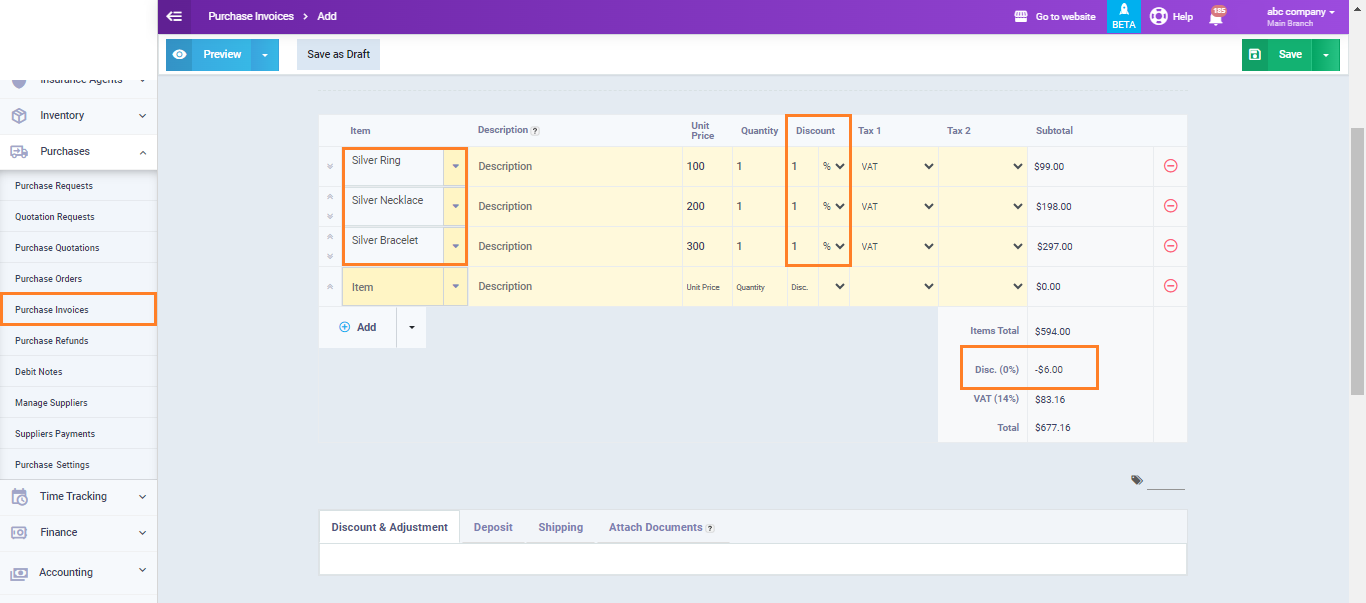 The system allows you to add a discount either at the invoice level as a whole or at the item level only within a purchase invoice. This is explained in detail below.