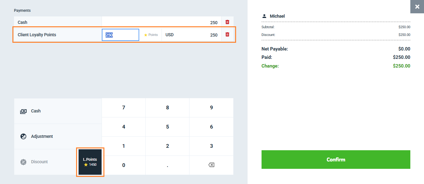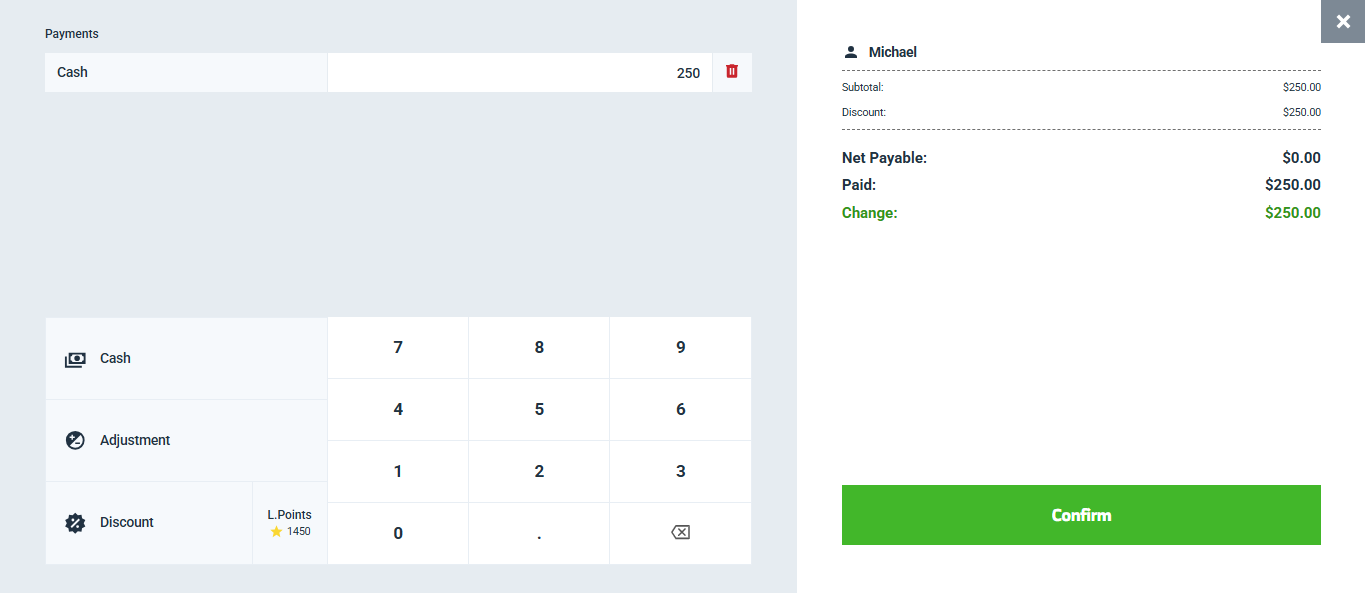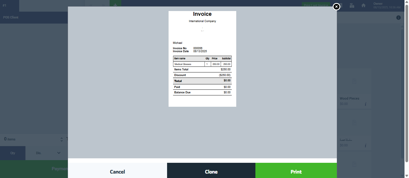 If the selected client has accumulated loyalty points, these will be displayed on the POS screen along with their equivalent monetary value. The client can choose to redeem these points as a full or partial payment toward the invoice, reducing the total amount due accordingly.