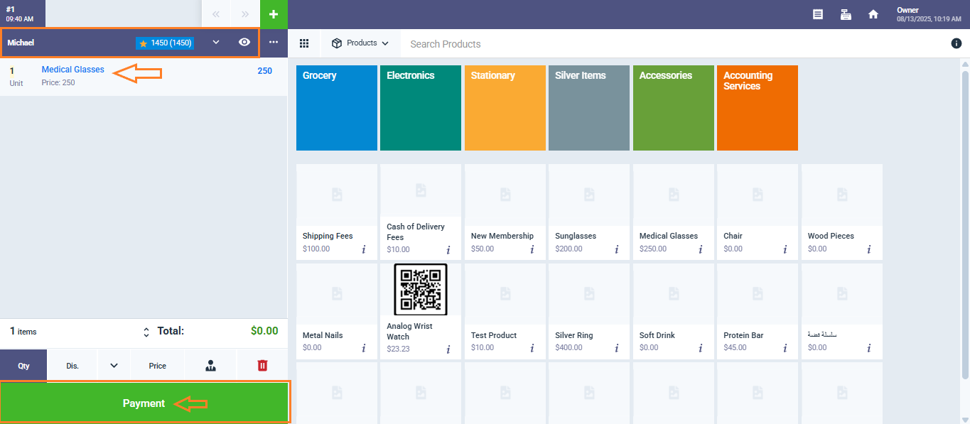 Once the client and product have been added, click on “Payment” to move to the payment screen.