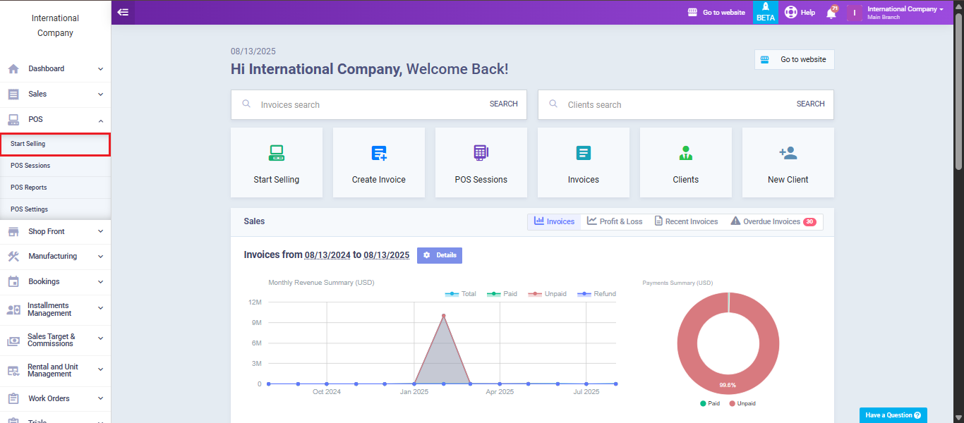 Select a client and add the desired product to the invoice to proceed with adding a payment.