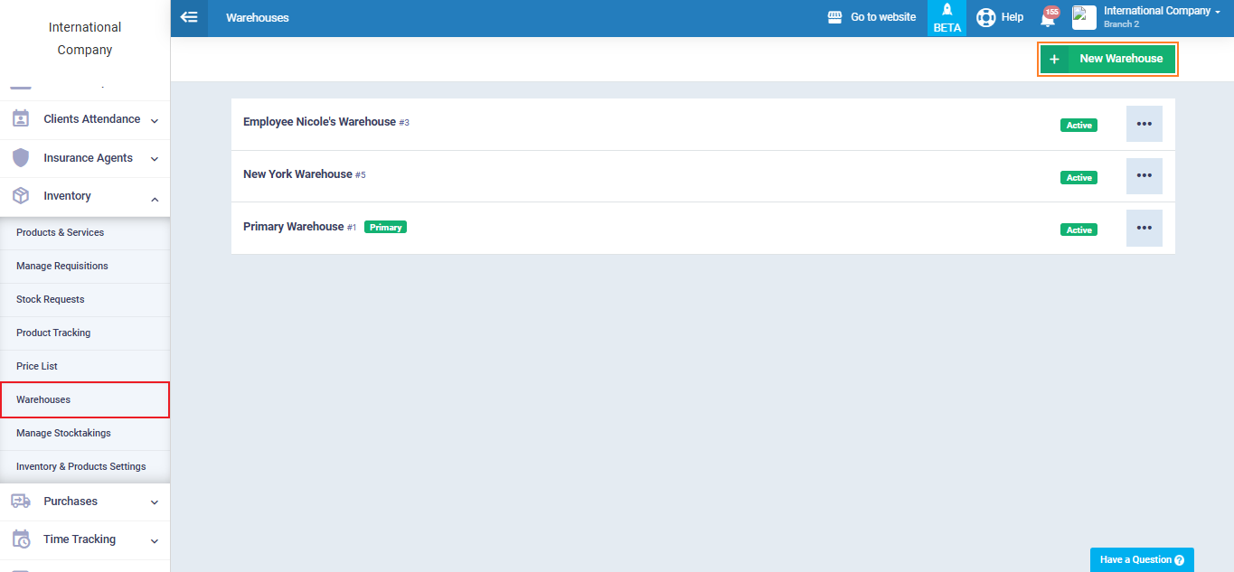 Click on the “Warehouses” dropdown from the “Inventory” in the main menu and click on the “New Warehouse” button.