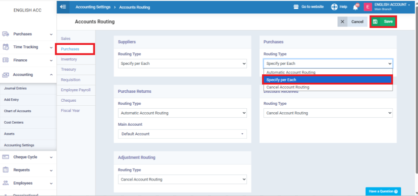 From the “Purchases” section, in the “Routing Type” field, click on “Specify per Each”, so you can route asset purchase transactions to the new account you created.