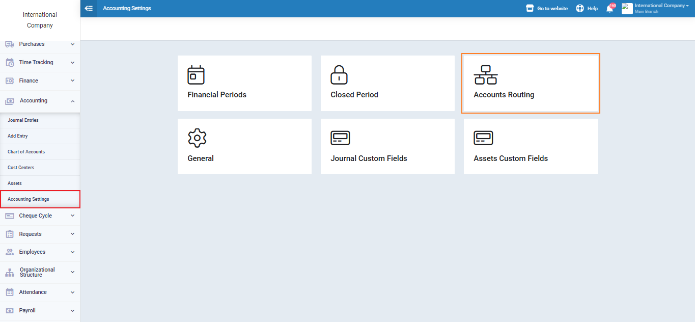 Click on “Accounting Settings” from the “Accounting” dropdown menu in the main menu, then click on “Accounts Routing.”
