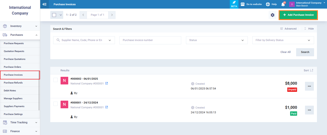 From the main menu click on “Purchase Invoices” in the dropdown of “Purchases“, then click on “Add Purchase Invoice“.