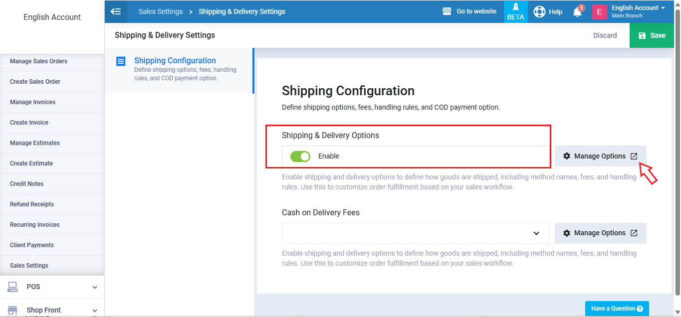 Enable the “Shipping and Delivery Options” option, then click the “Manage Options” button.