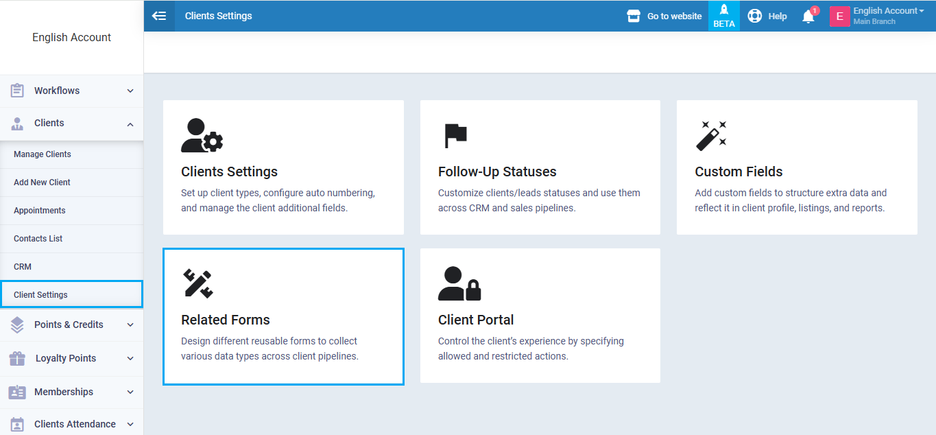 Click on “Client Settings” from the “Clients” dropdown in the main menu and click on the “Related Forms” card.