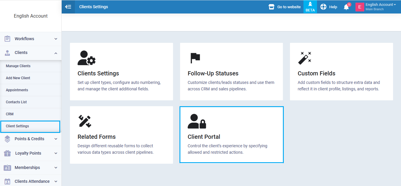 Click on “Client Settings” under “Clients” in the main menu, and click on the “Client Portal” card.