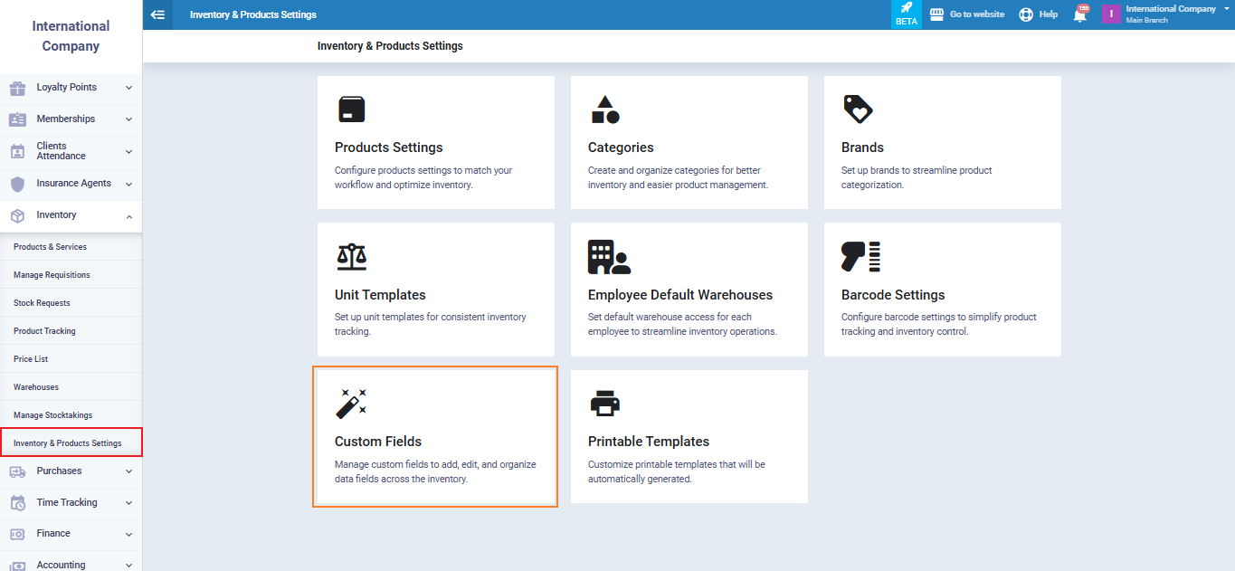 However, if you want to add a field to it, you can navigate to “Product Settings” dropdown under “Inventory” in the main menu. Then click on the “Custom Fields” card.