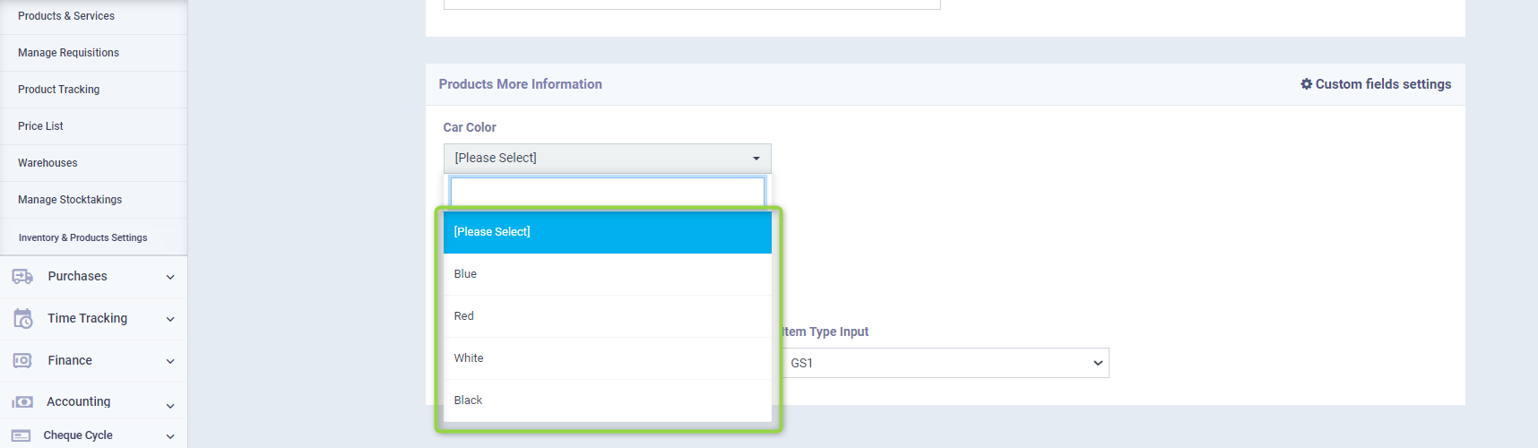 Let’s assume that your business is a car showroom and you want to specify the car color using a dropdown list with the available colors. How do you implement this through custom fields?