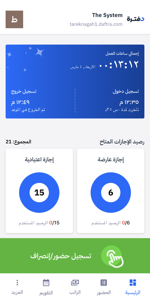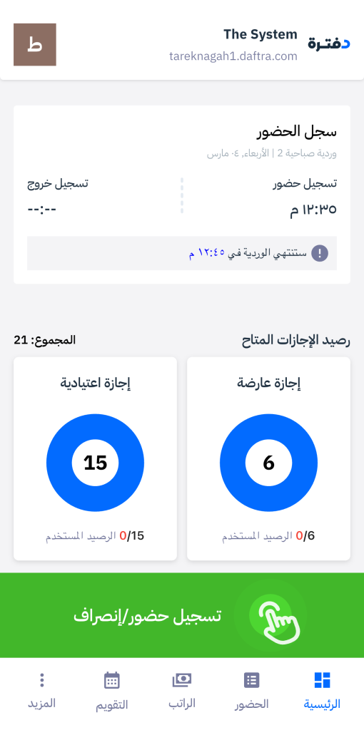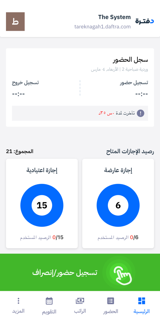 The Attendance record card on the homepage of the self-service app provides an instant and accurate overview of your attendance for the day, from check-in and check-out times to delay status, all the way to total working hours at the end of the day.