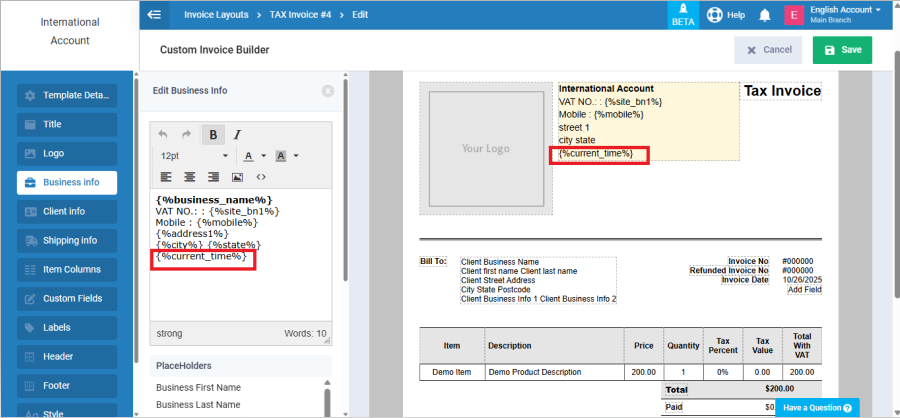 Choose the location where you want to display the invoice creation time or print time from the sidebar or by clicking on this section in the invoice itself. Place the arrow indicator in the location where you want to display the time field, click on the full variable guide, copy the time-specific fields, add them, and then click the “Save” button.