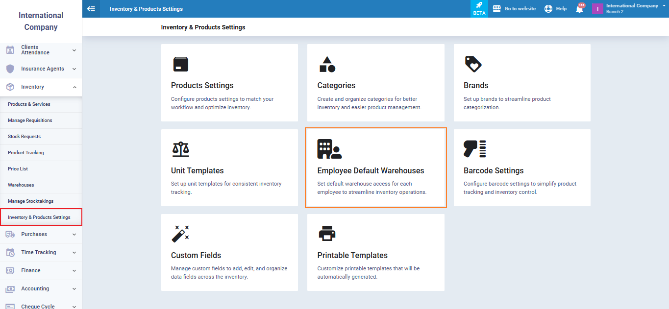 Click on “Inventory Settings” dropdown under “Inventory” in the main menu, then click on the “Employee Default Warehouse” card.