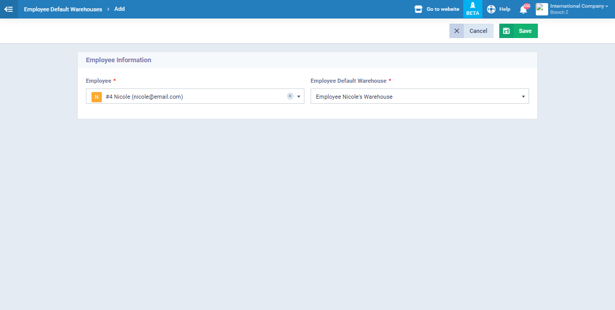 Select the employee from the dropdown list in the “Employee” field then choose the warehouse from the dropdown in the “Employee Default Warehouse” field.