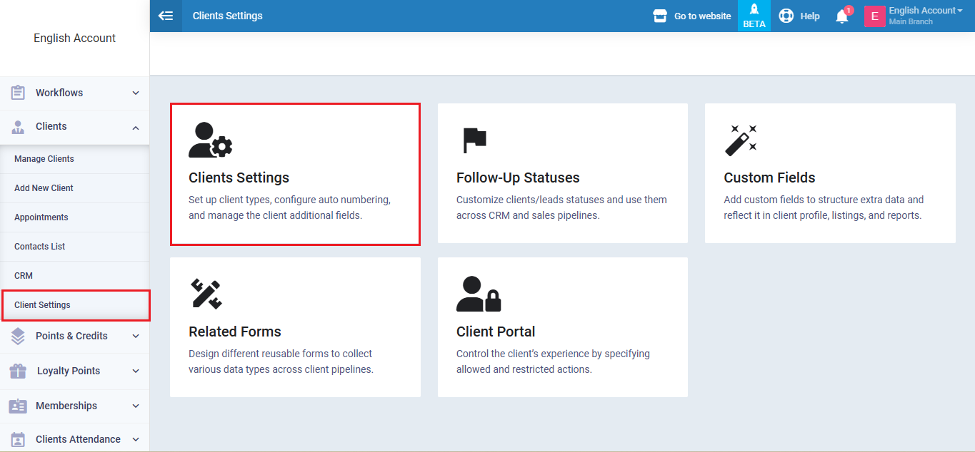 Client settings in the system help you manage client permissions, personal profile data, follow-up statuses, and other details. client settings are divided into: