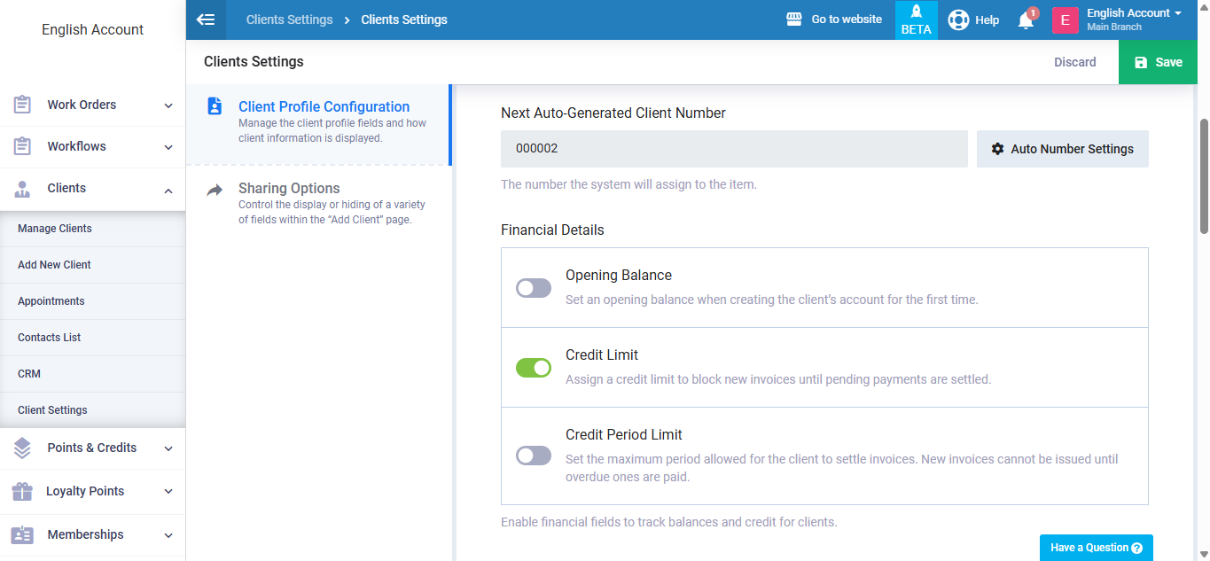 Enabling this option displays the number that the system will automatically assign to the next new Client profile, helping maintain organized and sequential Client records.