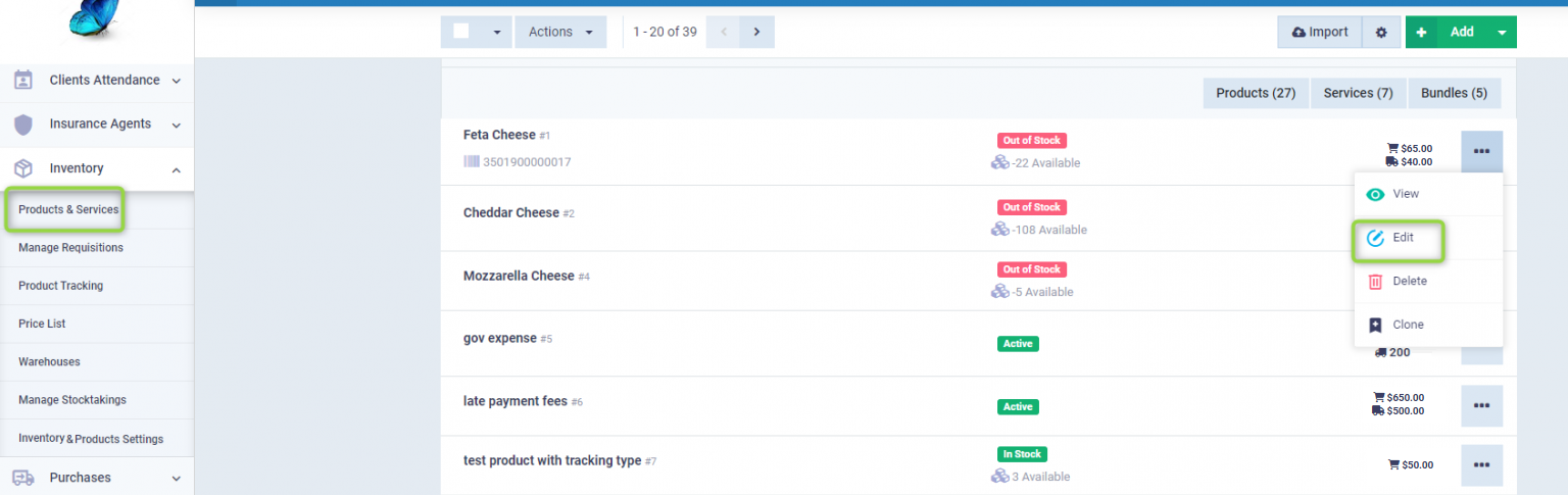 You can update any field of the data by editing each product’s information individually in the traditional way. Click on “Products & Services” from the “Inventory” dropdown in the main menu, and click on the dots next to the product you want to update one of its details, then click on “Edit”.