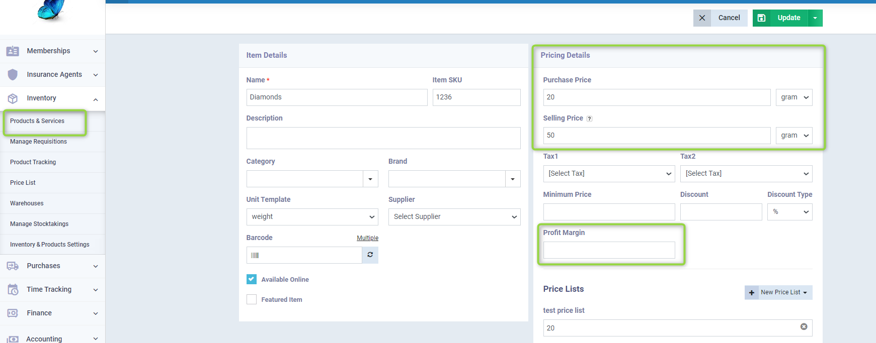 Change the selling or buying price, or both, or adjust the profit margin percentage, then press the “Update” button.