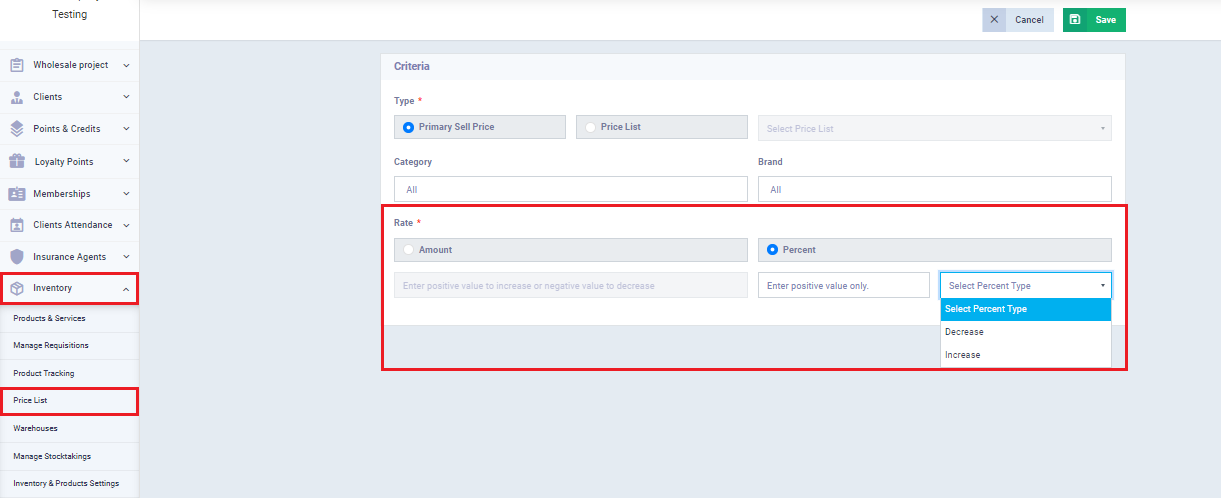 - When updating by percentage, enter the value without any signs, then choose the type of change: decrease or increase, as shown in the image.”