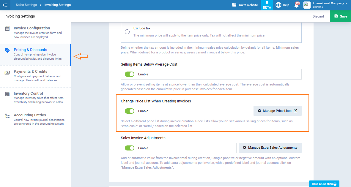 At the bottom of the panel, we activate ‘Change Price List When Creating Invoices.’ Then, press ‘Save.’