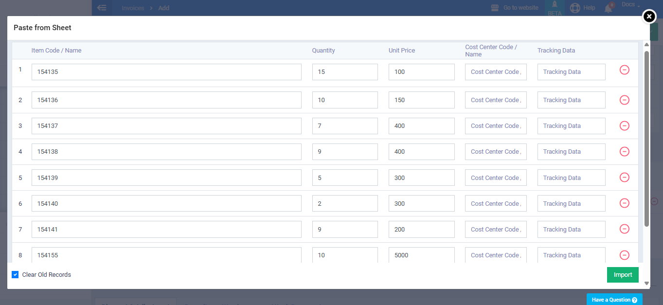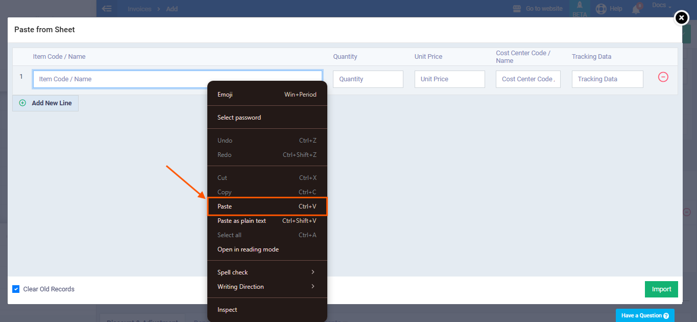 Once you click on “Paste,” make sure to add all the invoice items data, then click on “Import.”