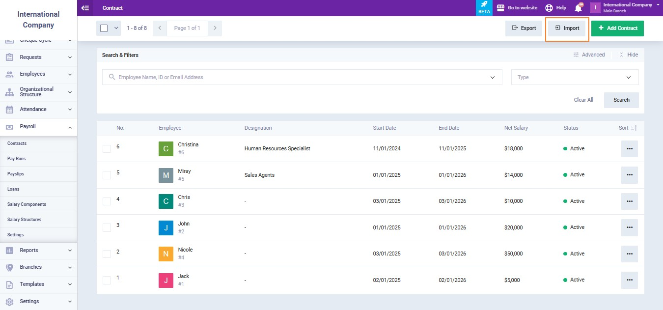 From the main menu click on “Contracts” from the dropdown menu of “Payroll“. Then, click on the button “Import“.