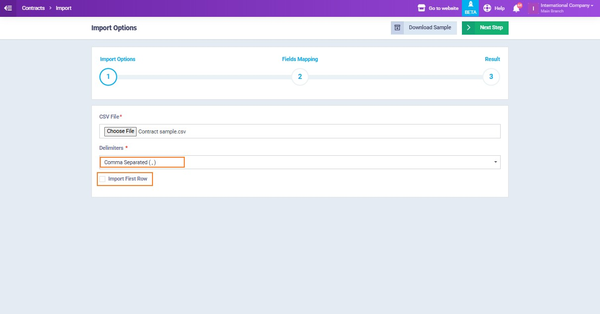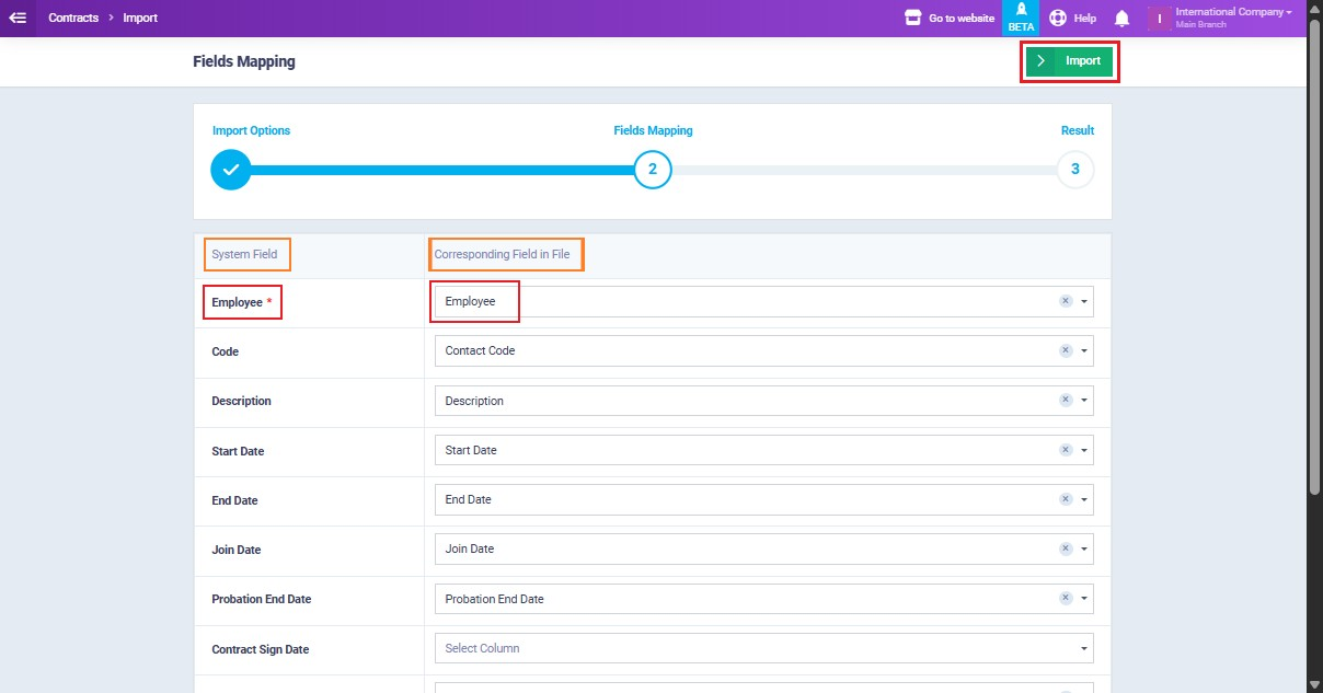 Match the data in the Excel file containing the contracts with the corresponding fields in the system. For example, if the column header for employees in the Excel file is “Employee Name/Code,” select this header corresponding to the “Employee” field in the system so that the system recognizes the type of each entry being uploaded. Then, click the “Import” button.