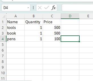 Start by creating an Excel file that includes the invoice items arranged in three columns:
