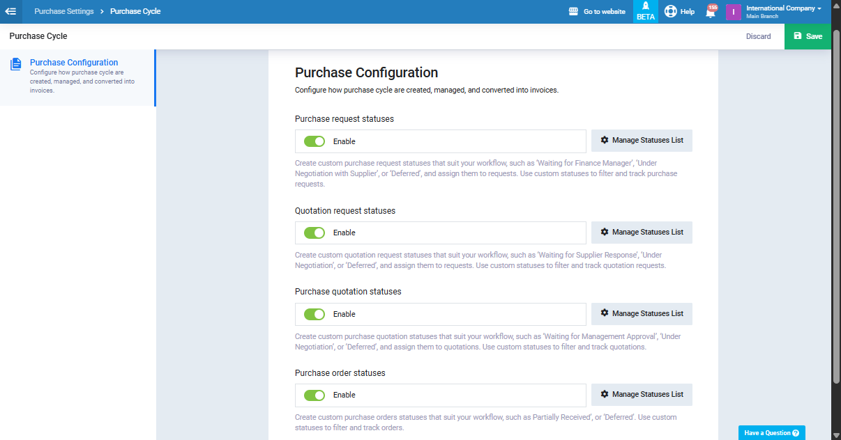 Enter the names and colors of the manual statuses you want to use to distinguish this type of purchasing document. Then, click on the “Save” button.
