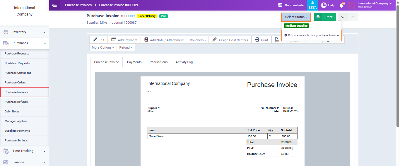 Here, you can see the difference in the types of manual statuses given to purchase orders compared to those given to purchase invoices based on the manual statuses you added for each type of purchasing document.