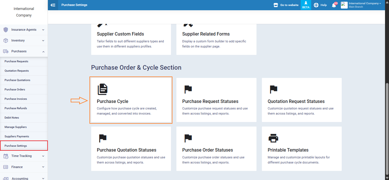 Click on “Purchase Settings” from the dropdown menu under “Purchases” main menu and click “Purchase Cycle” under “Purchase Order & Cycle Section“.
