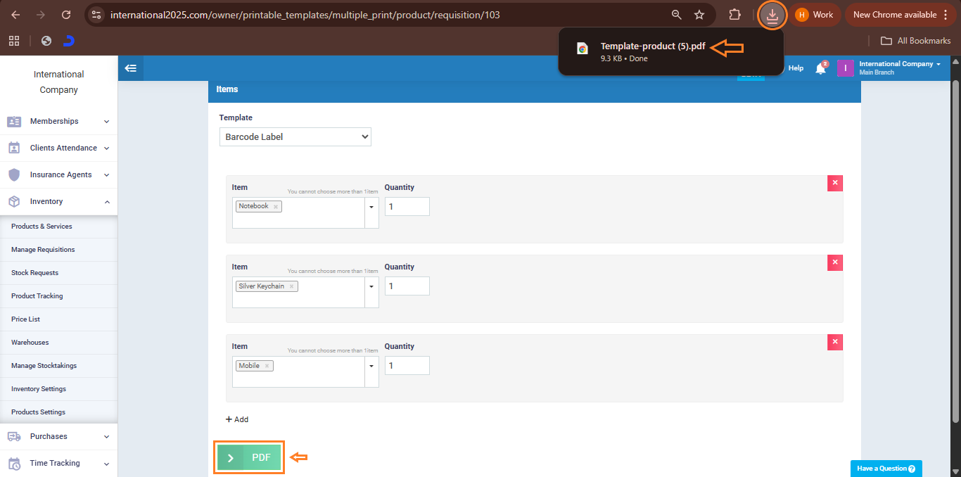 Once you finish entering the quantities, click on the “PDF” button at the bottom of the page to print all the barcodes for the selected products at once in a single file.
