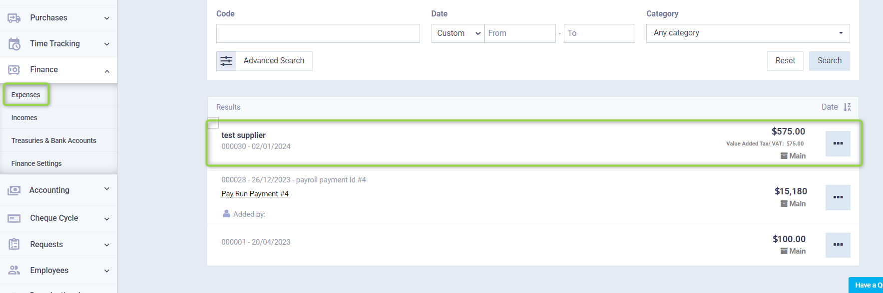 Note: After recording the expense on the app, it automatically appears in “Expenses” dropdown under “Finance” in the main menu, and it is automatically processed accounting-wise.