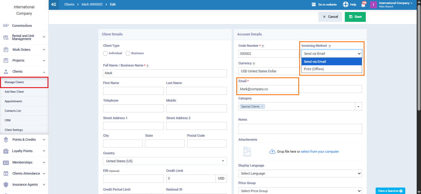 From the dropdown menu in the “Invoicing Method” field, choose “Both (Print and Email),” then click “Save“.