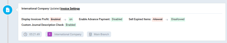 The system automatically records every change made to system settings, allowing you to see when the change occurred, who made it, the values before and after the change, and which branch was affected. You can also navigate directly to the setting that was modified.