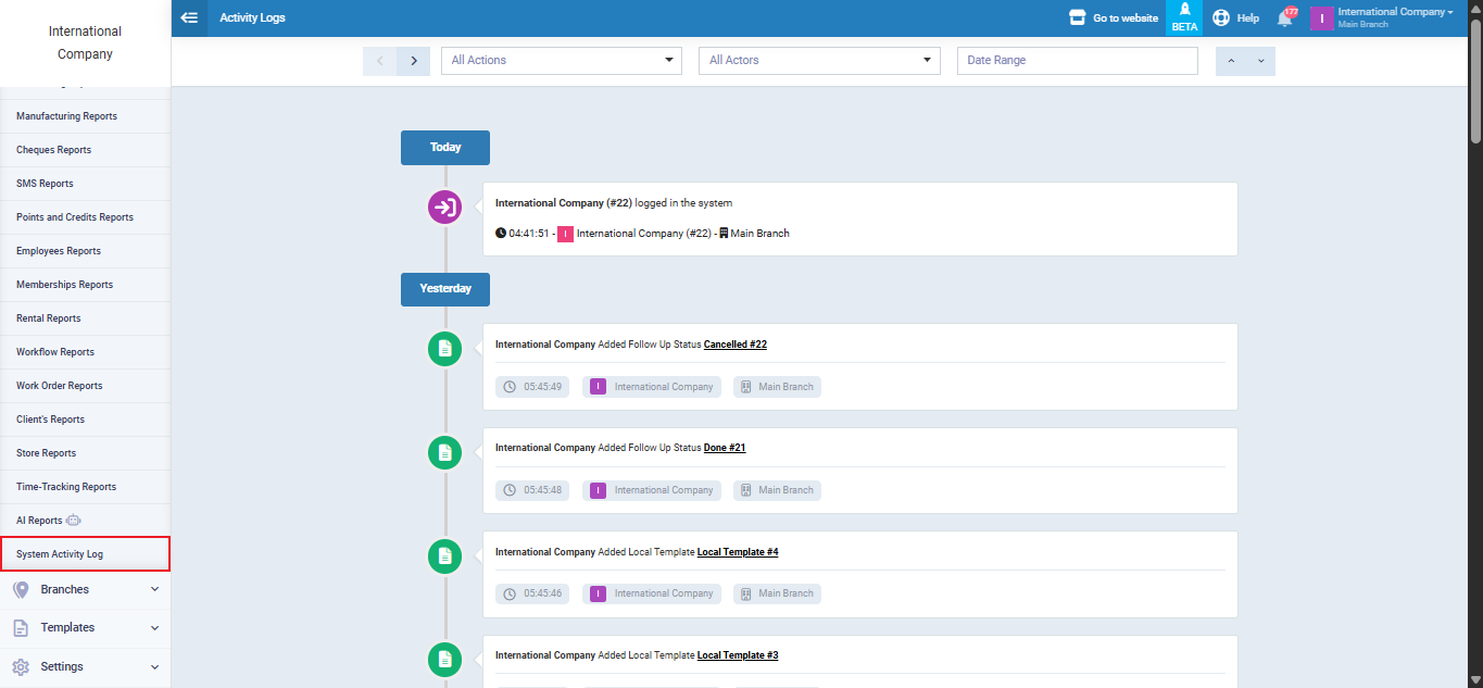- System Activity Log (from Reports): The primary reference for auditing and review, showing the full history of changes with search and filter options by date, user, or module.