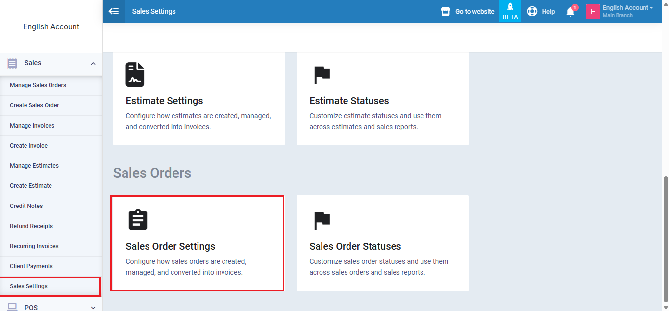 To enable sales orders click on “Sales Settings” from the dropdown of “Sales” from the main menu, and click on “Invoicing Settings“.