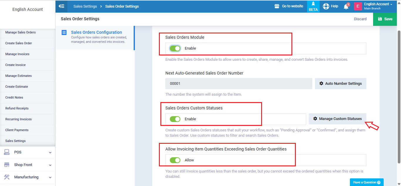 You can also enable “Sales Orders Custom Statuses” to control and manage sales order statuses by clicking the “Manage Custom Statuses” button.