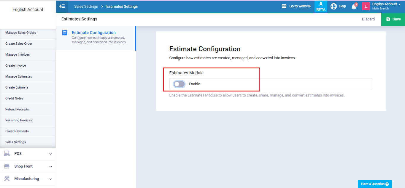 However, if you want to streamline the sales process further, you can enable the “Sales Orders” setting to make it an intermediate step between issuing estimates and invoices. This way, the sales cycle starts with an estimate, which, upon client approval, becomes a sales order to inform your employees. After approval, it converts into a sales invoice.