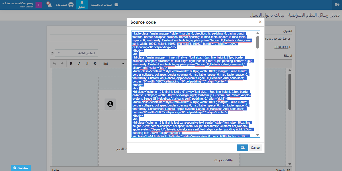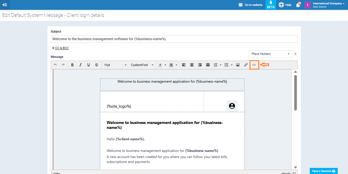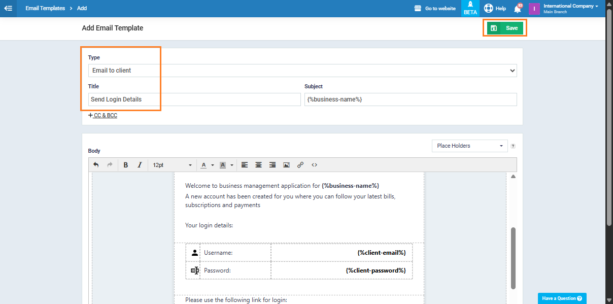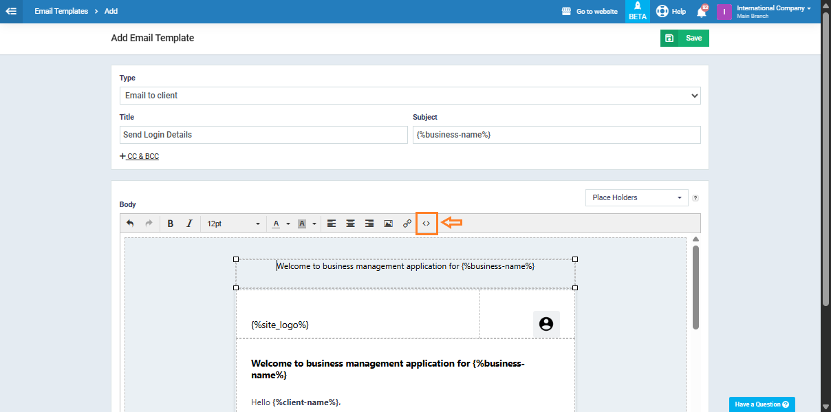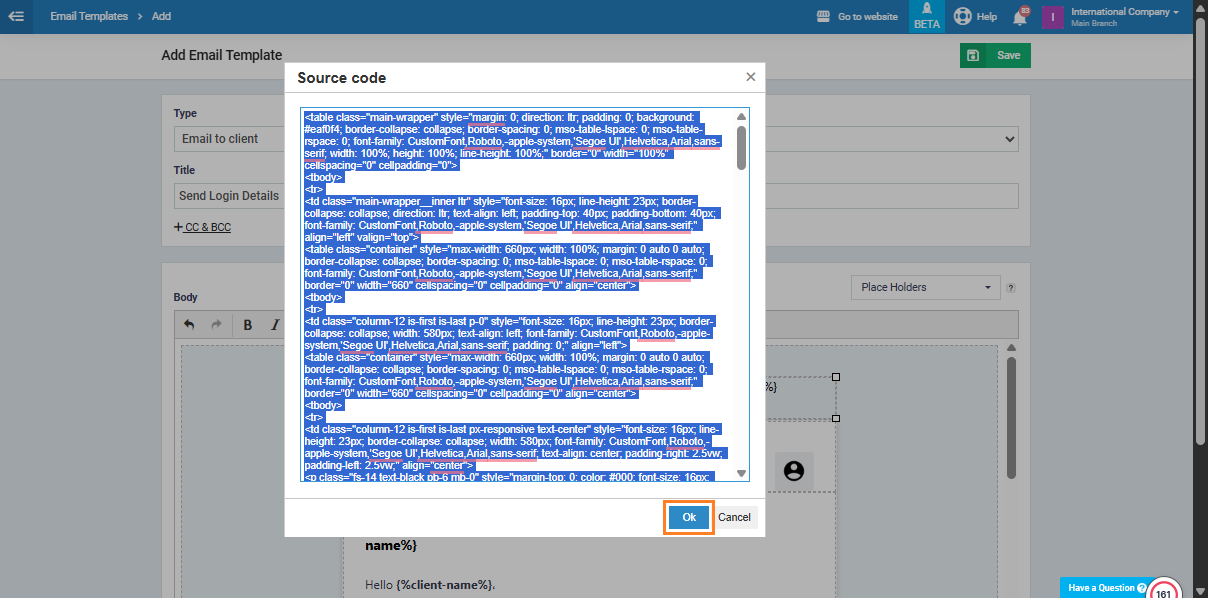 Inside the new template, change the type to “Email to Client” and the name to “Send Login Details.” Then, click on the “Source Code” button,