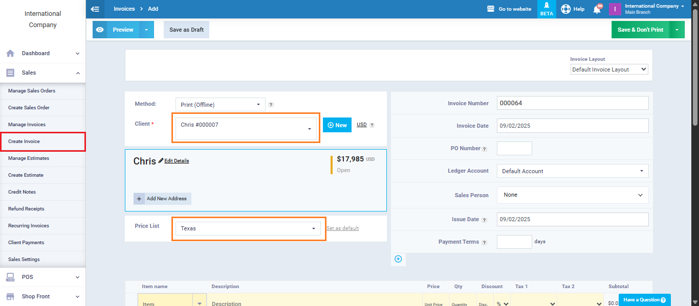 Now, when you go to the “Create Invoice” screen and select the client that has already been linked to the price list, the list will appear automatically, as shown below.