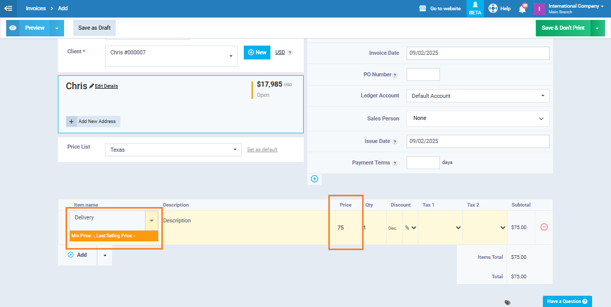 Add the service “Delivery” in the item table, and the pre-set unit price from the price list will appear automatically.