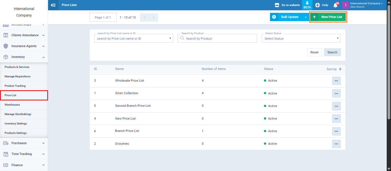 Now, go back to the main menu and click “Inventory”, then from the dropdown select “Price Lists.”
