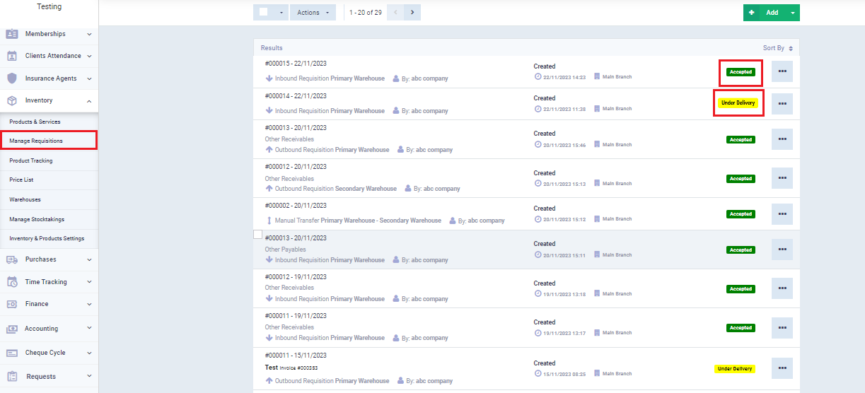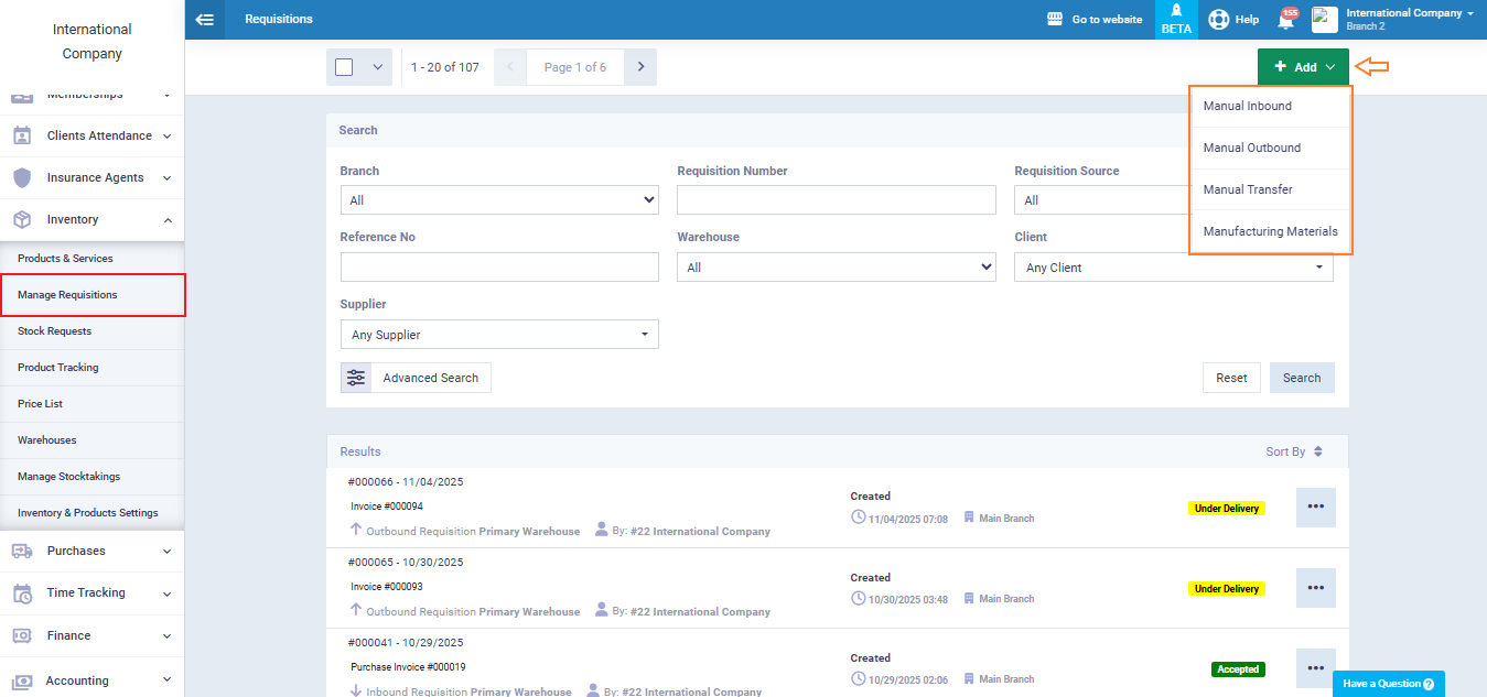 Click on “Manage Requisition” under “Inventory” in the main menu. Then, click on the “Add” button and choose between: