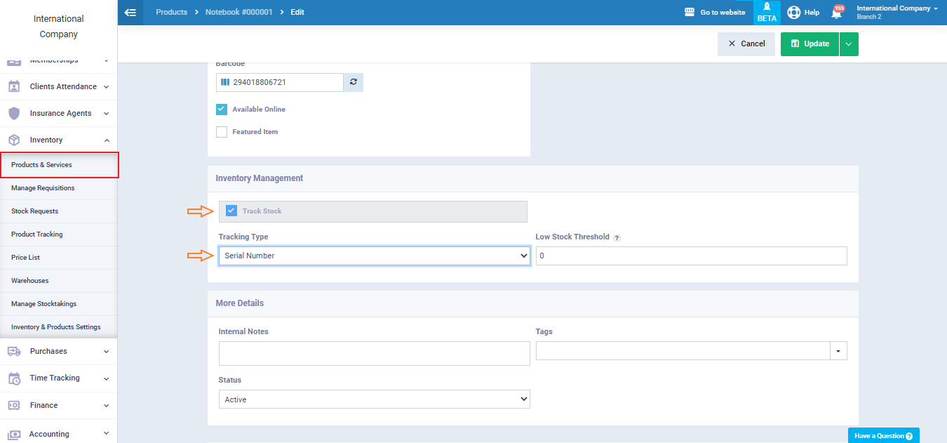 To set the tracking type, click on “Products and Services” under “Inventory” in the main menu, and select the product for which you want to choose the tracking type, or make the selection when adding the product from the beginning.
