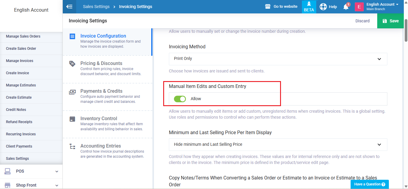 Enable the setting “Manual Item Edits and Custom Entry” and click the “Save” button.