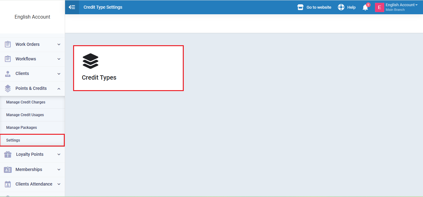Click on ‘Settings’ under ‘Points and Credits’ in the main menu and then click on the ‘Credit Types’ card.”