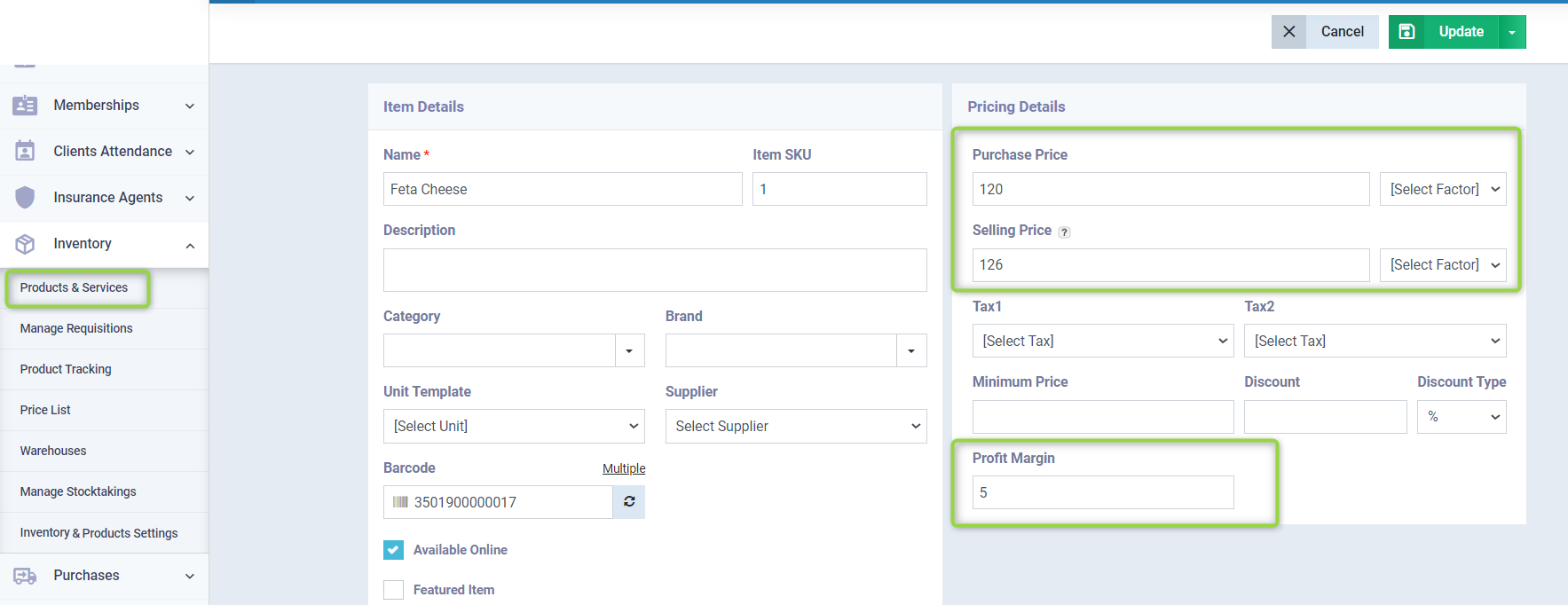 Then move to the pricing details and write the profit margin percentage you want for this product, or specify the buying and selling price so that the system calculates the profit margin percentage automatically for you, then click on the “Save” or “Update” button.