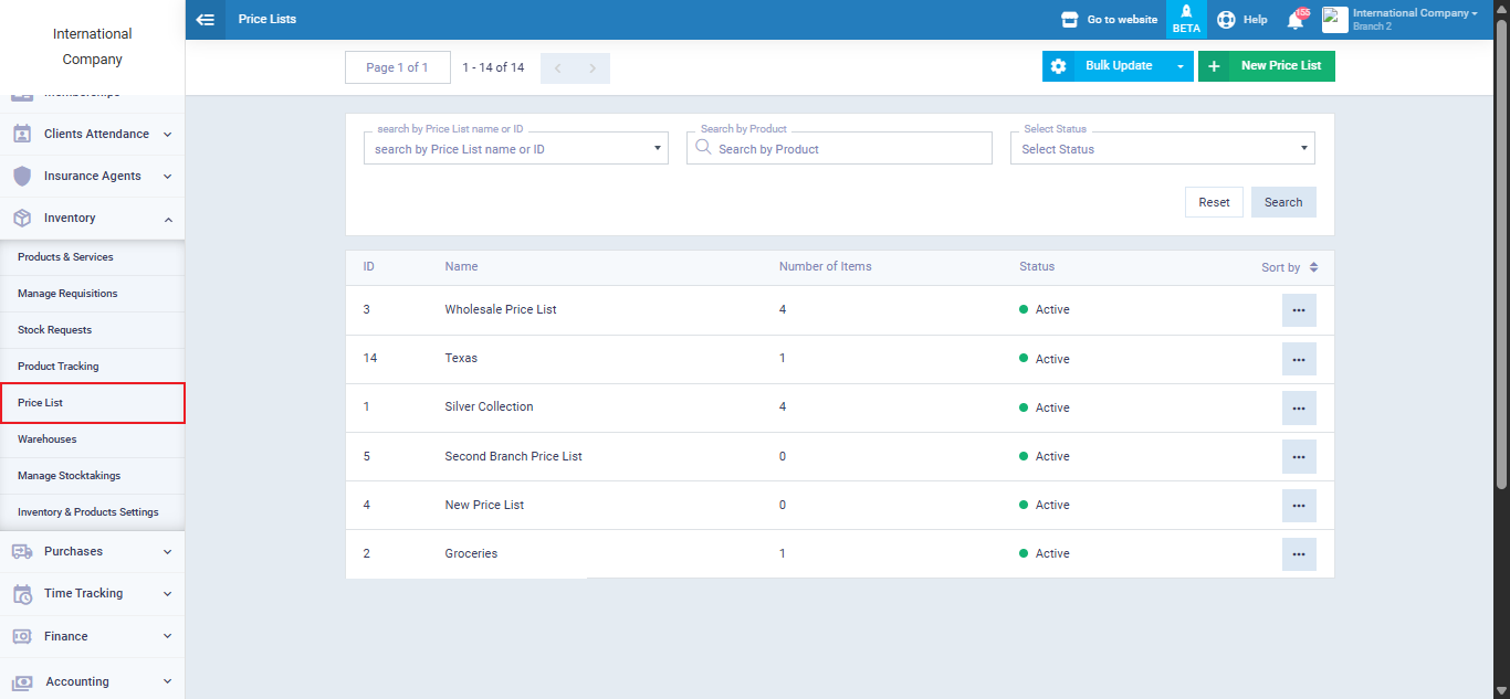 To create a new price list in the system, click on ‘Inventory’ from the main menu, select ‘Price List,’ and then click on the green button at the top of the panel that says, ‘New Price List.'”